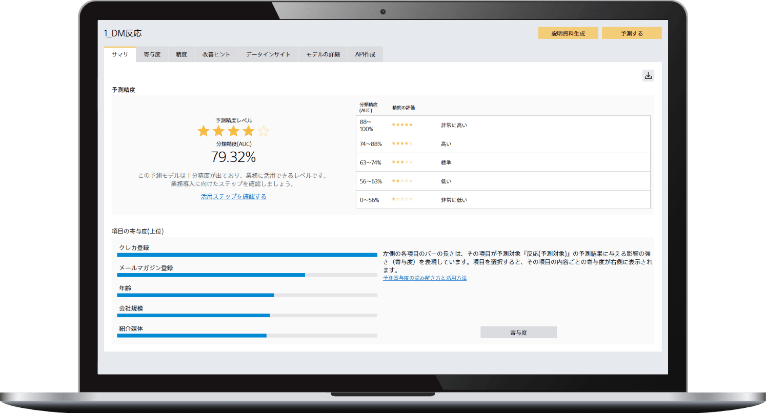 Prediction Oneはデータの各項目が予測に与える影響の強さを明確に提示し、生成AI搭載機能と合わせて、お客様の効果的な意思決定を支援します。