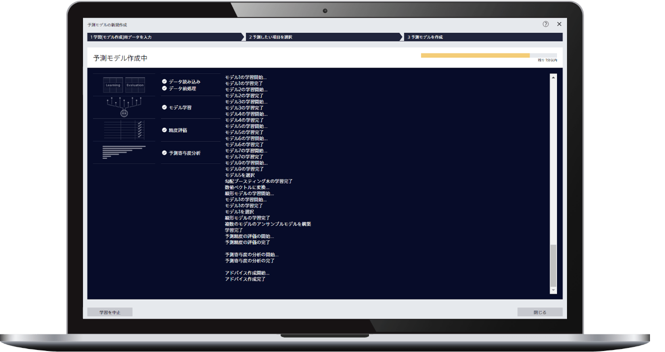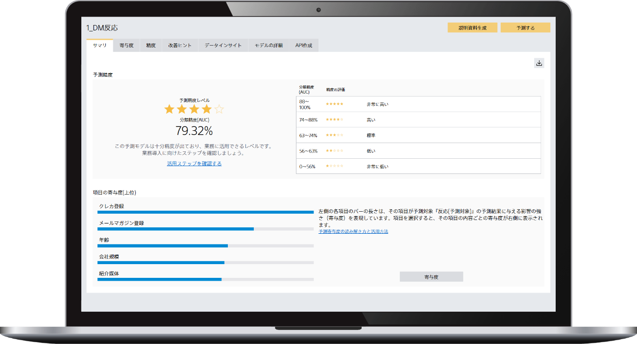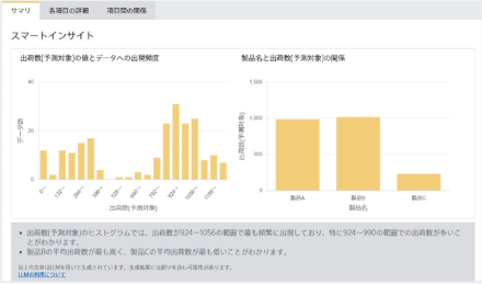 予測精度、データの各項目が予測に与える影響の強さ、精度改善のためのヒントなどがわかりやすく表示されます。