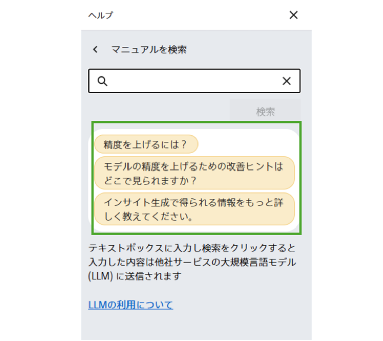ヒント機能では、学習データの「項目名」が入力(送信)されます。資料生成機能では、「項目名」「精度評価値」「予測タイプ」「予測対象の項目の統計 (数値予測のみ)」「予測期間 (時系列予測のみ)」が入力(送信)されます。